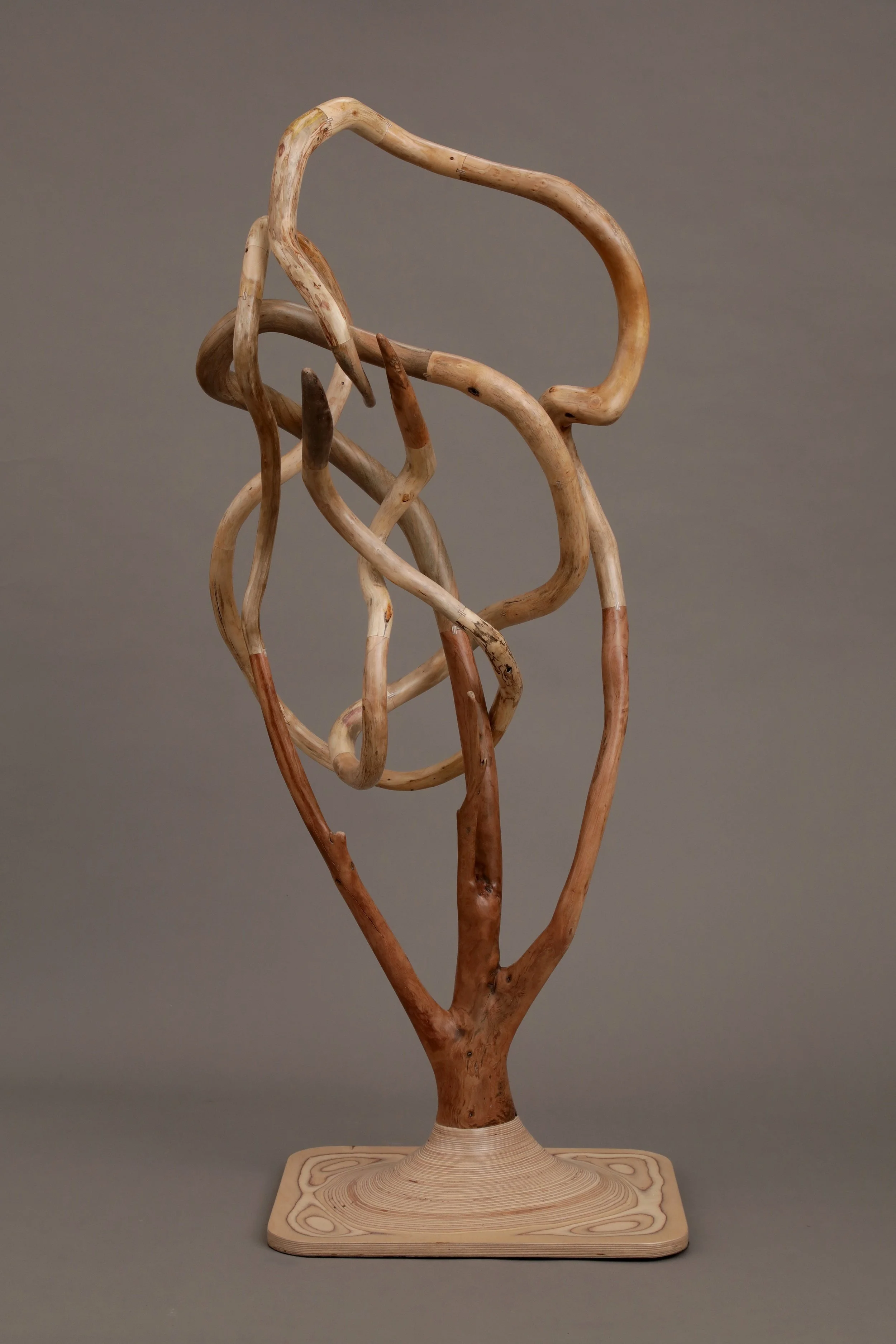 This floor-standing Beach Master stands at eye level with the viewer and brings the power of nature's work into life-sized focus. Storm-battered driftwood is transformed into highly-worked hardwoods recovered from wild Alaska beaches. The Baltic birch plywood base was hand-laminated by the artist.